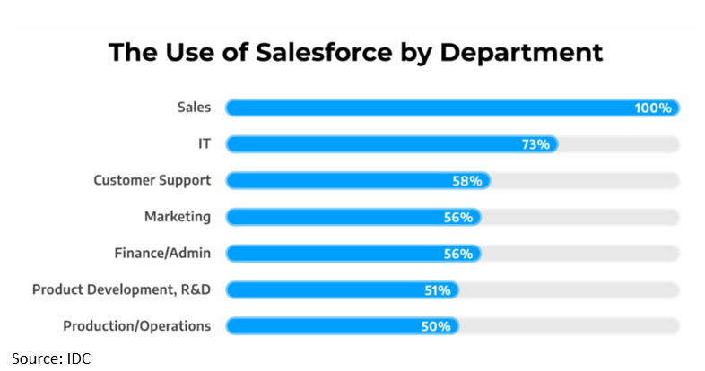 Regarding departmental usage of Salesforce within the company, traditionally, it is the sales department that predominantly utilizes Salesforce. They are succeeded in usage by the IT department, followed by Customer Support, Marketing, and the Finance/Administrative departments. In contrast, the Product Development and Operations departments exhibit comparatively lower utilization of Salesforce, as evidenced by the accompanying graph. This highlights that Salesforce serves to optimize the entire business, contrary to the common perception that it is exclusively employed by the Sales department. Below, you’ll find a breakdown of the specific Salesforce products employed by various departments: