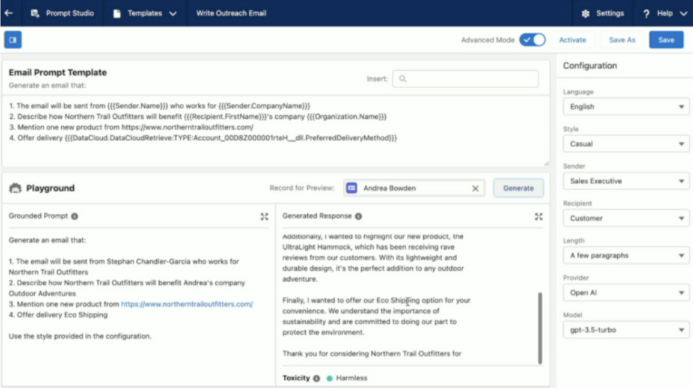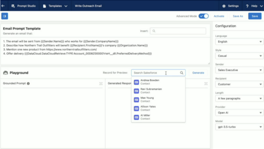 Now, it’s time to witness your prompt in action! Give it a spin and see how it behaves when you apply it to a specific record in Salesforce, like a contact. The magic behind it all? Prompt Builder seamlessly integrates with Data Cloud, tapping into your metadata to infuse that extra layer of context into your prompts. It’s all about putting your creation to the test and ensuring it performs just as you envisioned.