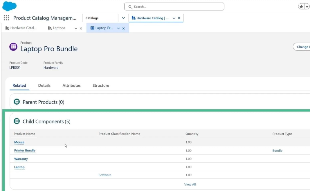 In this slide, we see a product called Laptop Pro Bundle created under the Hardware family. This is a bundle product, meaning it contains multiple child components.
