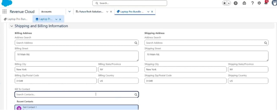 This slide shows the Account record for the customer FutureTech Solutions. Before creating a quote, we must have an Account.