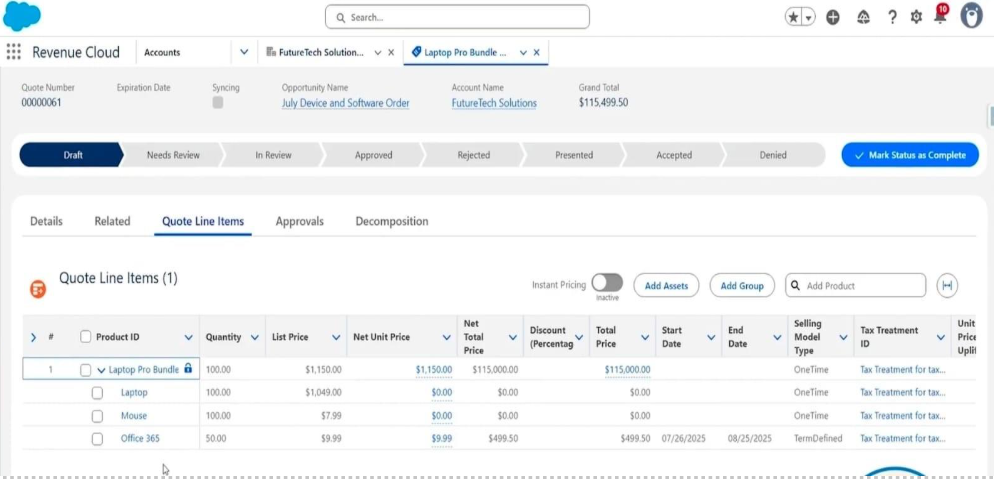 Here we see the Quote page under Revenue Cloud. The Quote is in Draft stage and linked to: