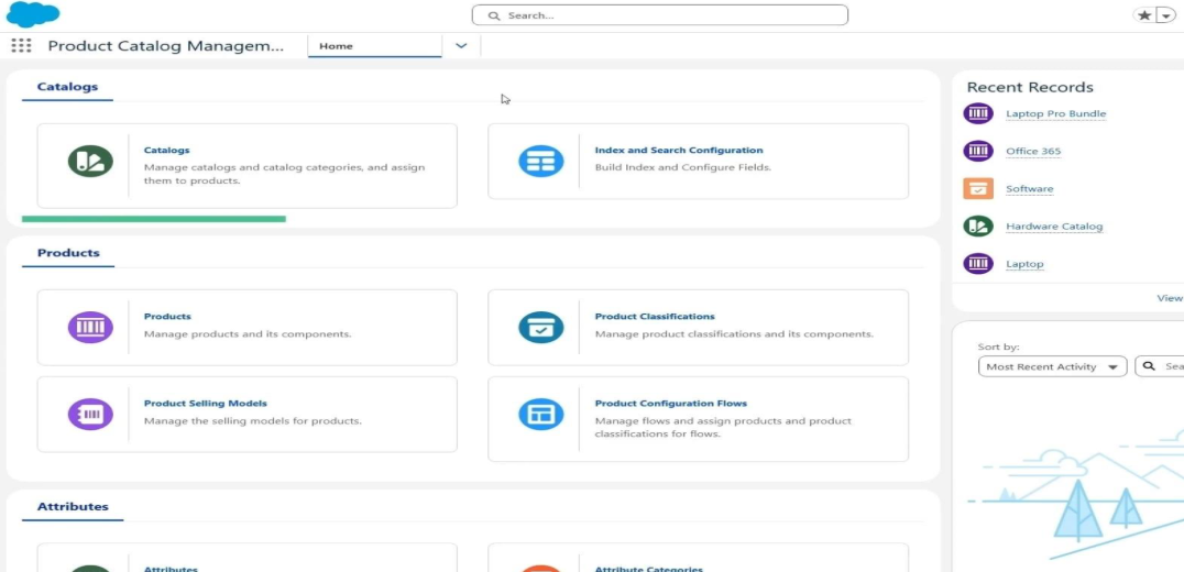This is the starting point of the Revenue Cloud setup. In this screen, we manage all product-related configurations required before selling anything. The Catalogs section is used to organize products into logical groups like Hardware or Software. The Products section allows us to create individual products and define their structure.