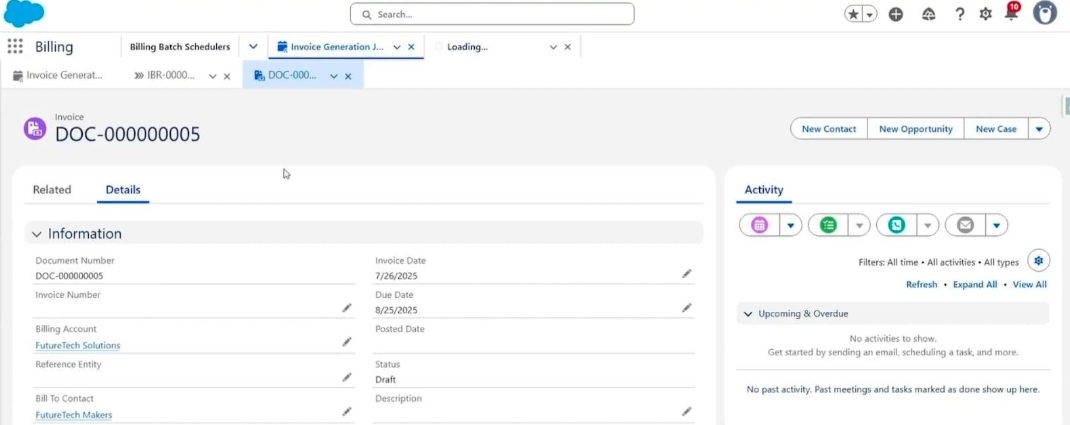 It includes: Document Number, Invoice Date, Due Date, Billing Account, Status (Draft).