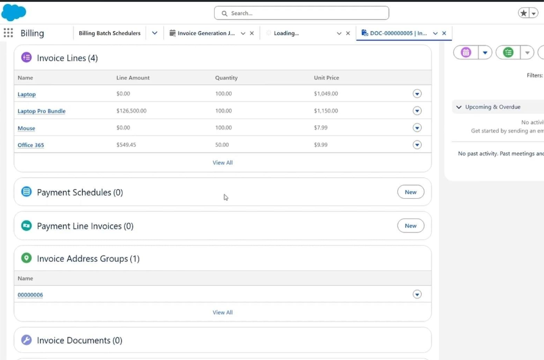 After the Quote is accepted and Order is created, the billing process begins. This slide shows Invoice record .